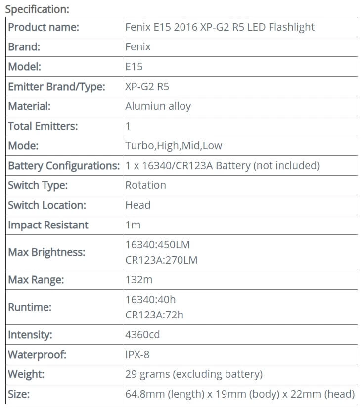 If you’re carrying around a flashlight, it better be able to take some rough handling. The E15 is packed with features that will keep it safe from bumps, drops, splashes or whatever comes its way. The light is made of lightweight aerospace grade aluminum that has further been hard anodized to resist corrosion or scratches.