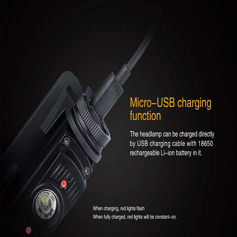 Featuring a micro-USB port for go-anywhere charging, the Fenix HL60R Headlamp delivers a maximum output of 950 lumens, beam distance of up to 381ft, and a runtime of up to 100 hours from just one rechargeable 18650 Li-ion battery. The Fenix HL60R is one of the best rechargeable headlamps on the market. This feature rich headlamp is equipped with neutral white LED for better color rendering, a side switch to activate the five brightness levels, and the red reading light.
