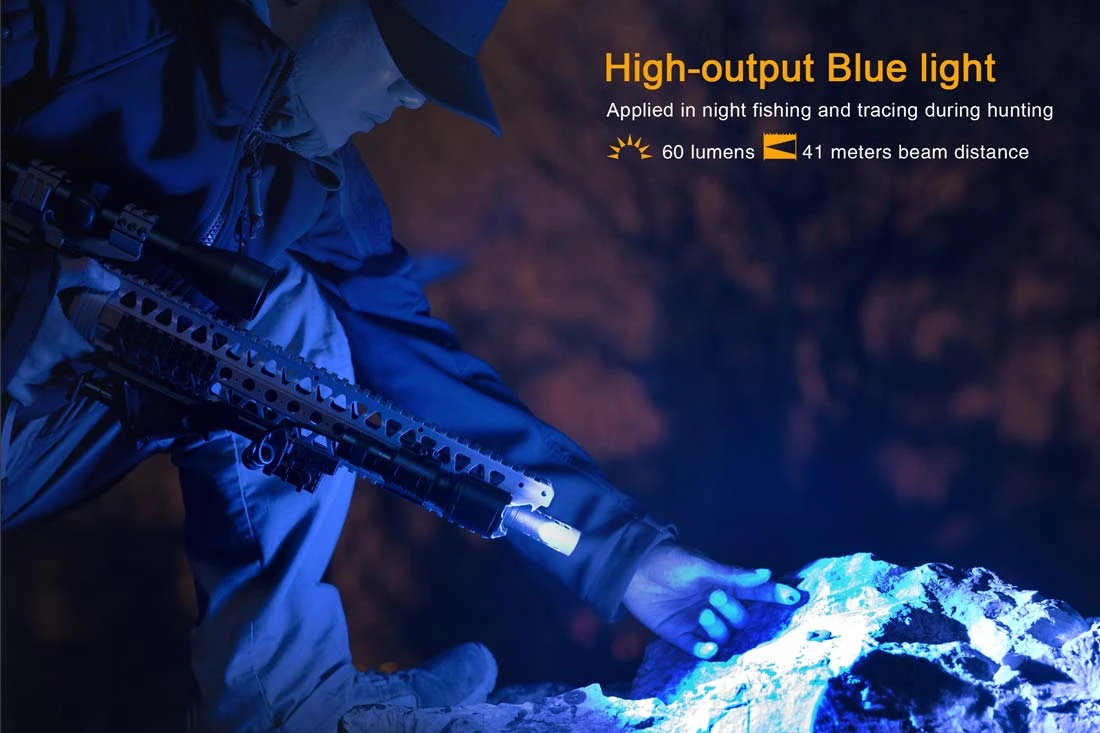 The Fenix TK25 R&B version flashlight features multi-colored LEDs built in an innovative mode switching operation. This patent pending operation allows for the user to have two separate operating products in one compact flashlight. With a simple twist of the head, the user can switch from high performance white LED flashlight mode, to the red light flashlight and blue light flashlight to support your hunting or searching needs. The high-performance flashlight features a white light that includes 4 levels of output and variable strobe. The Turbo setting emits a max output of 1000 lumens and beam distance of 738 feet (225 meters). Simply twist the head of the TK25RB and your light is transformed into colored LED operation with the option of high and low red light, with a max of 150 lumens, and the blue light at 60 lumens. This Red & Blue version of the TK25 can be of great support in your hunting, work, or search functions. Purchase this product today and SEE WHAT MATTERS!