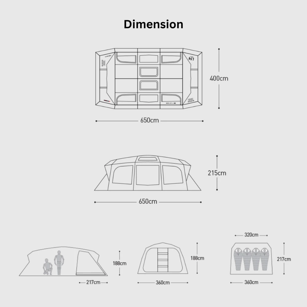 - Size: Installed: 650 x 400 x (h)215cm | Storage: 89 x 50 x (h)37cm | Inner tent: 360(320) x 217 x (h)188cm