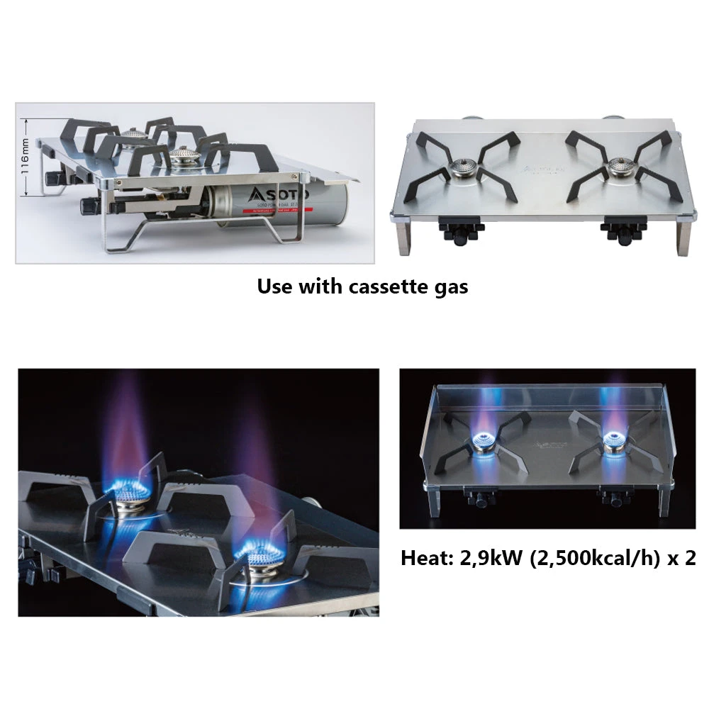 - Material:Â Main body: stainless steel | Trivet: iron | Stand/windshield (for back, both right and left): aluminum | Ignition switch/appliance plug knob: resin